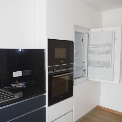 Composto por hall de entrada com roupeiro embutido, sala de jantar ampla com bastante luz e varanda, cozinha com móveis termo laminados brancos, tampo em granito, equipada com placa vitrocerâmica, forno, microondas, máquina lavar louça e combinado, da marca Siemens.